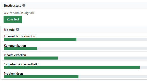 Die Lerneinheiten sind in Lernkomponenten unterteilt. Ein Einstiegstest ermittelt dein Vorwissen – Vorkenntnisse sind nicht erforderlich. Der Abschlusstest zeigt, wie weit Du gekommen bist. Der sogenannte Lernpuls misst Deine Aktivität, das Lernradar visualisiert Deinen Fortschritt entlang der Module und Lernpfade.